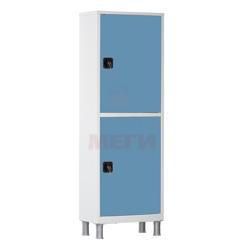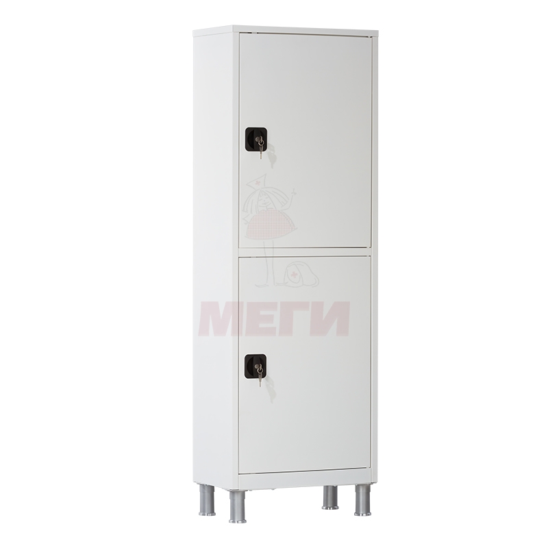 Медицинский металлический шкаф с двумя секциями и одной створкой, оснащенный металлическими дверцами и ригельным замком, а также ножками высотой 150 мм, разработан для упорядоченного размещения и безопасного хранения лекарственных средств, перевязочных материалов, хирургических инструментов, различных медицинских расходных материалов и прочих изделий медицинского назначения.