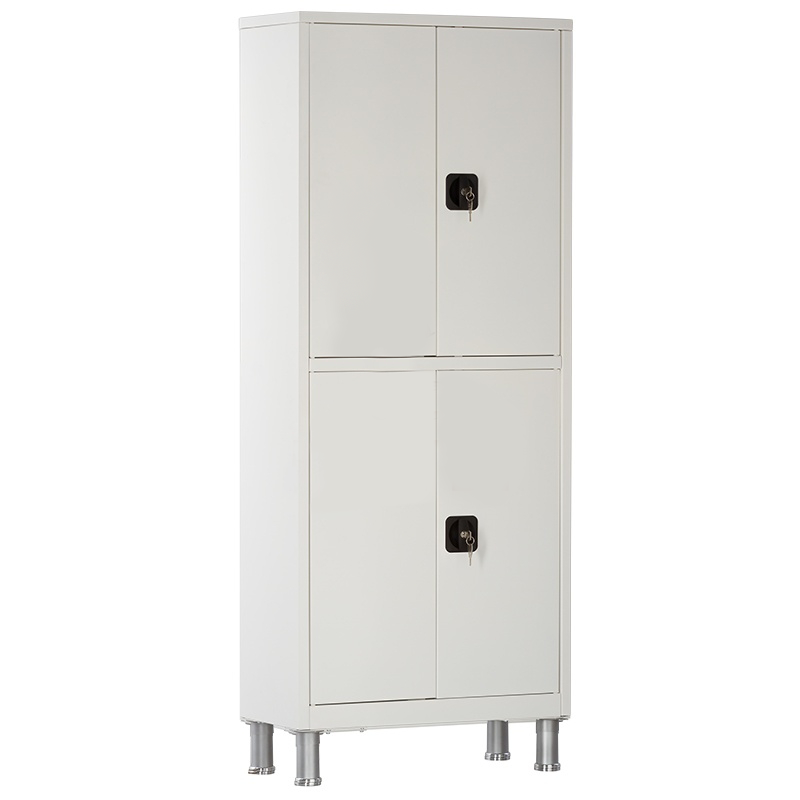 - Двери металлические, усиленные П-образным профилем, обеспечивают дополнительную жесткость. Втулки из ПВХ в осях дверей исключают люфт и способствуют плавному ходу. Правые двери оснащены ригельными замками с поворотной ручкой, что обеспечивает повышенную безопасность хранения. Левые двери оборудованы магнитными защелками.