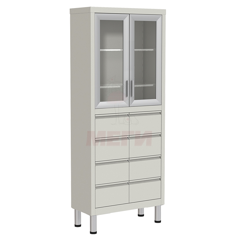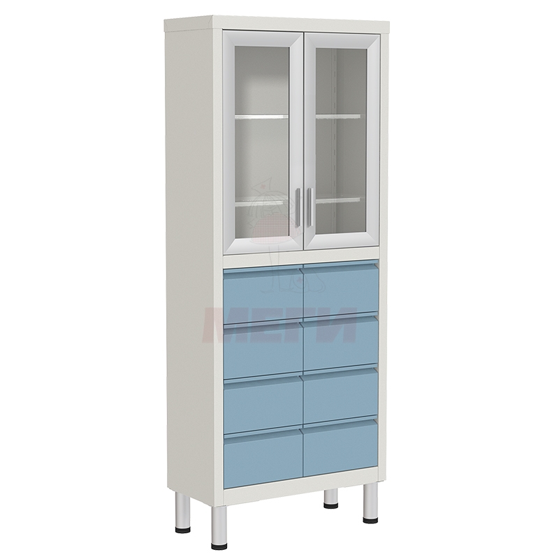 Медицинский металлический шкаф МСК-653.12 представляет собой высокофункциональное двухсекционное двустворчатое решение, спроектированное для оптимального хранения медицинских принадлежностей. Верхняя часть шкафа оснащена остеклением в алюминиевом профиле, а нижняя — восемью выдвижными ящиками с ригельным замком для повышенной безопасности. Ножки высотой 150 мм обеспечивают удобство размещения и уборки.