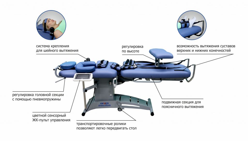 ОРМЕД-Тракцион – это инновационный подход к лечению патологий позвоночника. Этот многофункциональный стол для горизонтального вытяжения обеспечивает контролируемую декомпрессию, снижая внутридисковое давление и способствуя восстановлению структуры диска. Благодаря возможности проведения сухого вытяжения, "Ормед-Тракцион" становится незаменимым инструментом в консервативной терапии заболеваний межпозвоночных дисков, предлагая эффективную альтернативу хирургическому вмешательству при грыжах позвоночника. Система позволяет гибко настраивать параметры процедуры, а инфракрасный обогрев кушетки усиливает терапевтический эффект, подготавливая мышцы к вытяжению.