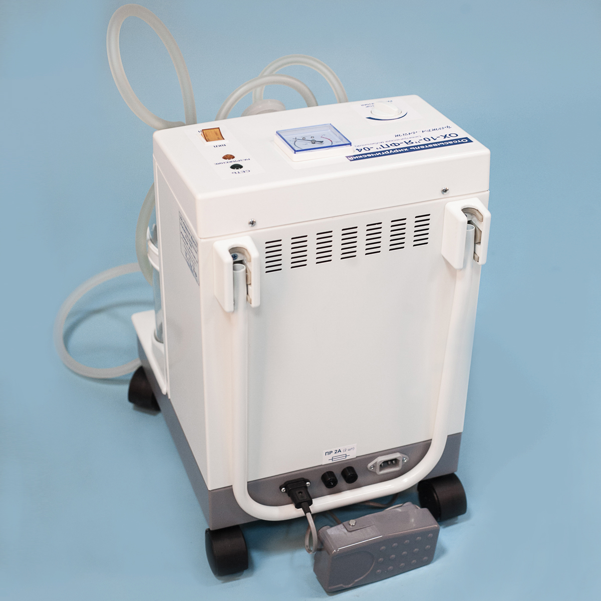 ОХ-10-"Я-ФП"-04 представляет собой современный аспиратор на устойчивой колесной базе, оснащенный двумя стеклянными емкостями-сборниками. Устройство функционирует от стандартной сети 220 В, а управление вакуумным поршневым насосом осуществляется как с интуитивно понятной панели, так и посредством удобного ножного пульта-педали.