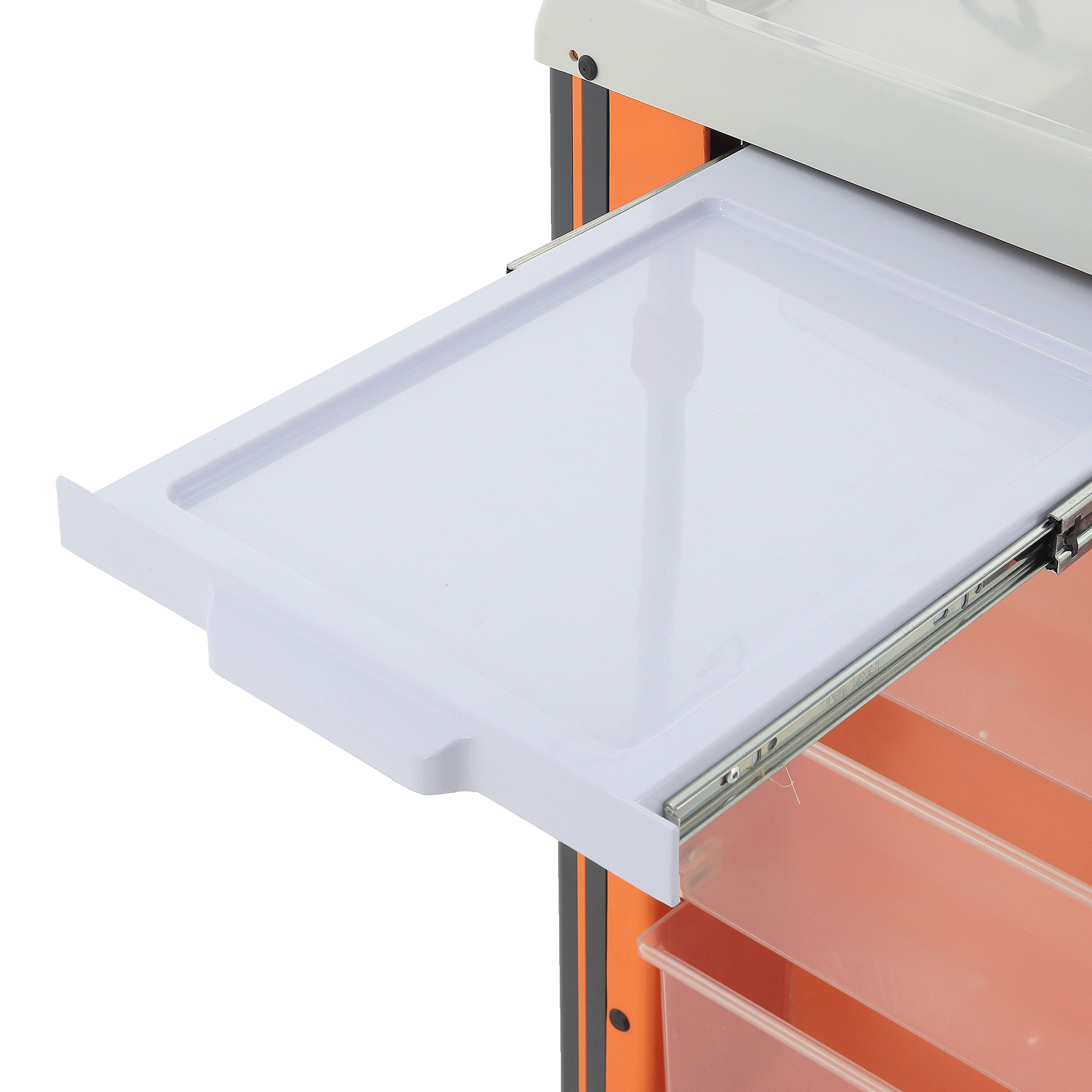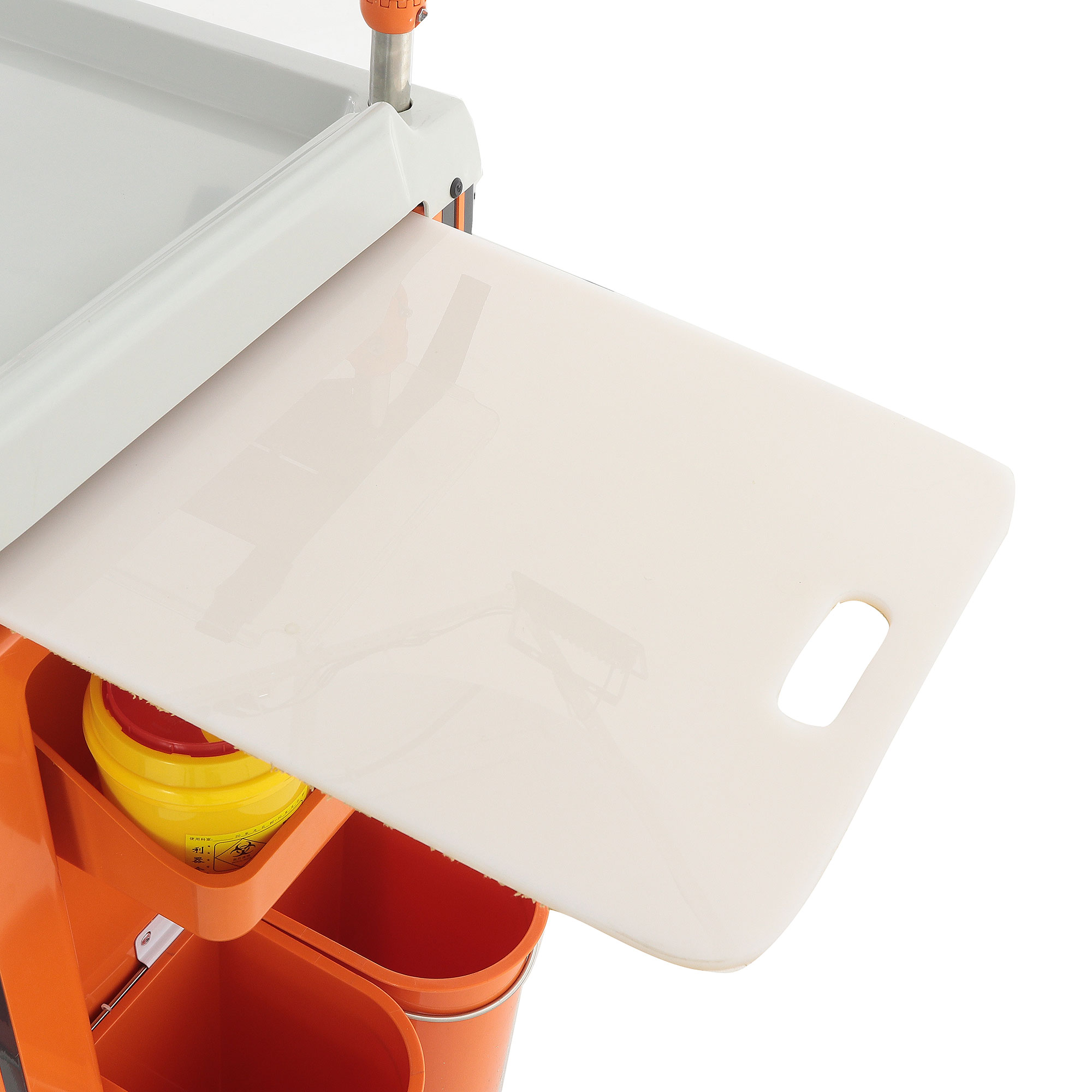- Высококачественные материалы: Столик изготовлен из нержавеющей стали, АБС-пластика и полиуретана, что обеспечивает долговечность, устойчивость к дезинфицирующим средствам и легкость в уходе.