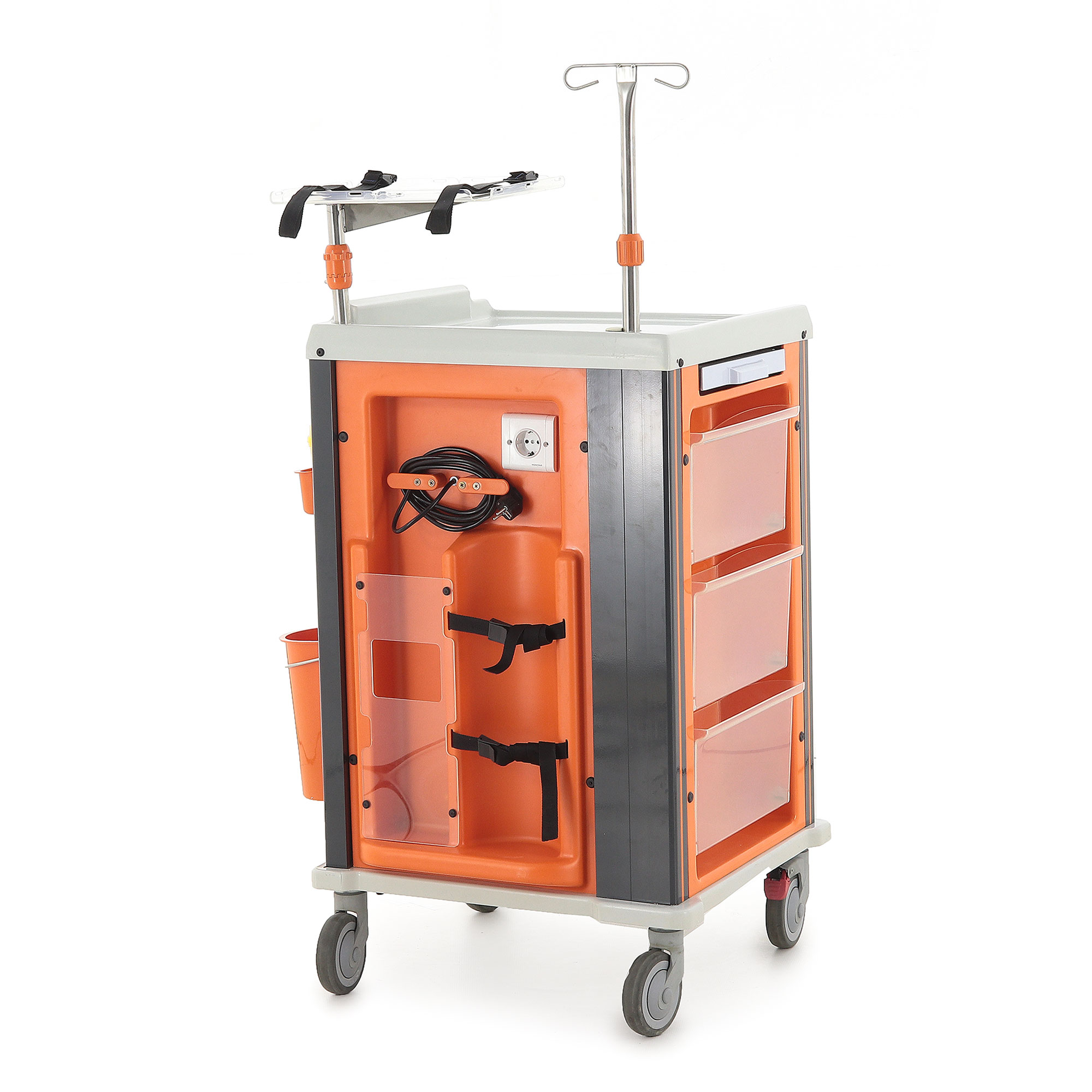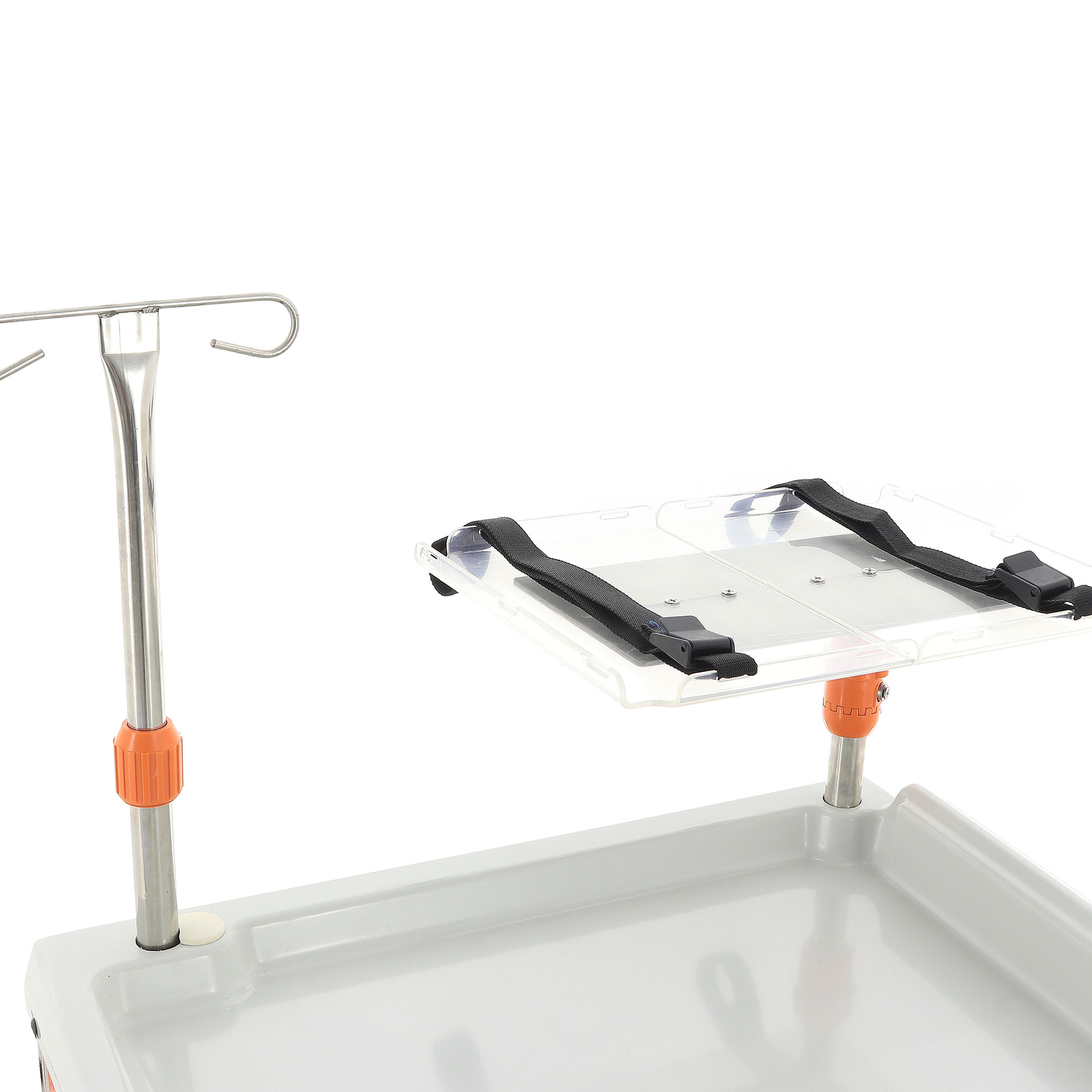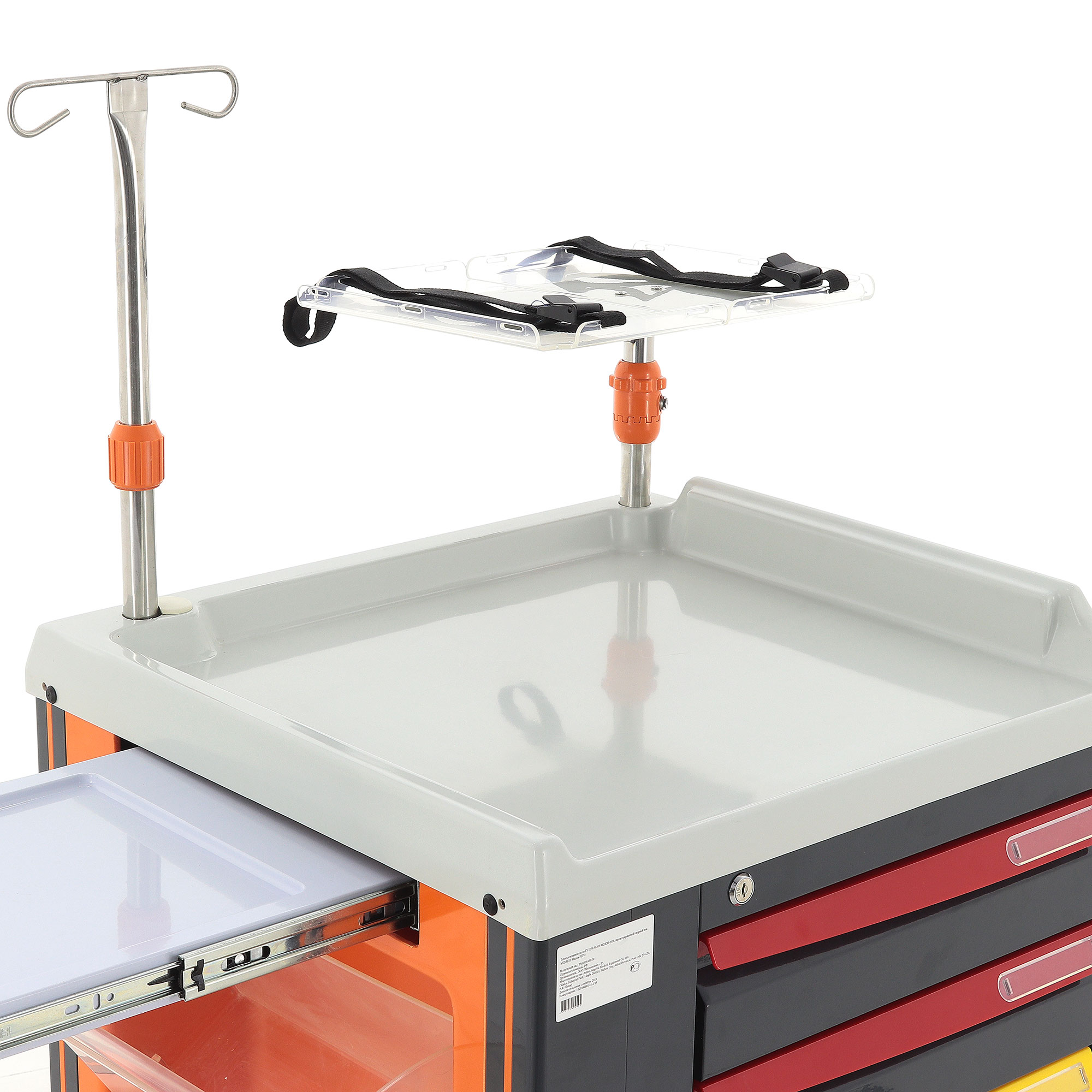 - Дополнительные элементы для удобства: Выдвижной столик и поднос увеличивают рабочую площадь, а инфузионная стойка с регулируемой высотой (от 300 до 740 мм) обеспечивает комфортное проведение процедур. Поворотная навесная полка с держателем (360×120×130-340 мм) предназначена для размещения мелких предметов.