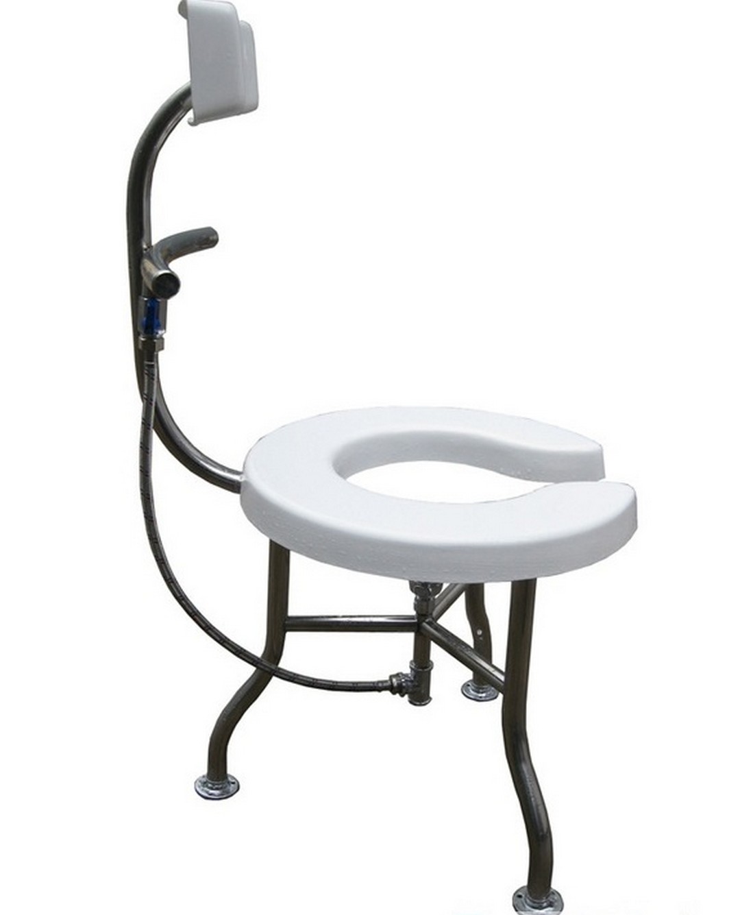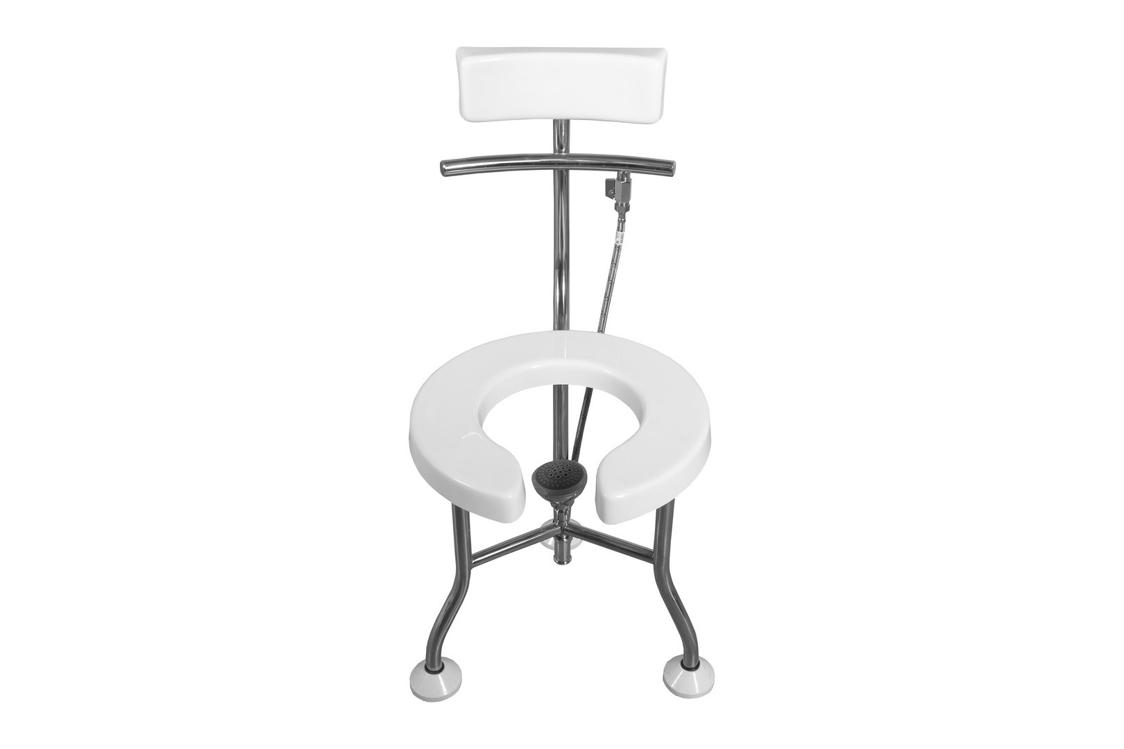 Модель восходящего душа с поясничной форсункой представляет собой эргономичный стул с кольцевидным сиденьем и комфортной спинкой, изготовленными из высокопрочного стеклопластика. Рама стула выполнена из высококачественной нержавеющей стали, что гарантирует долговечность и безопасность использования в условиях водоснабжения и медицинских учреждений. Конструкция надежно фиксируется к полу посредством крепежных болтов.