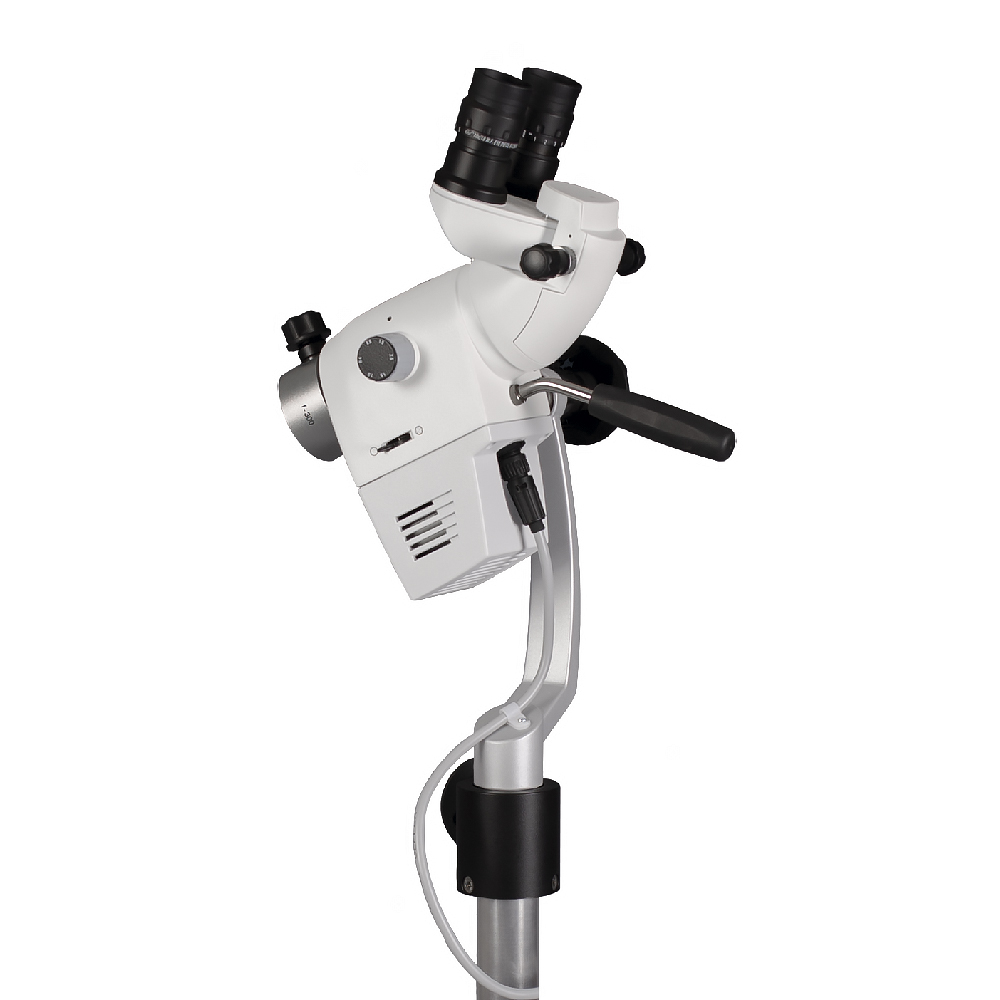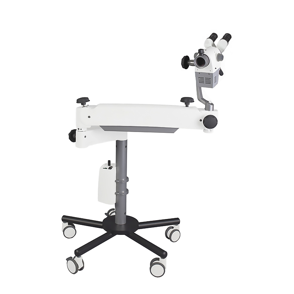 Консольный штатив обеспечивает свободное позиционирование плеча и оптической головы в рабочей зоне. Возможность регулировки положения оптической головы и бинокулярный тубус с углом 45° позволяют врачу комфортно адаптироваться к любым видам манипуляций. Мобильное пятилучевое основание с 5 колесами и системой фиксации гарантирует стабильное положение прибора во время исследования.