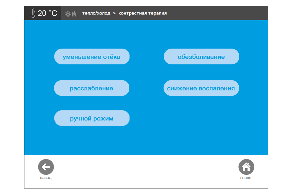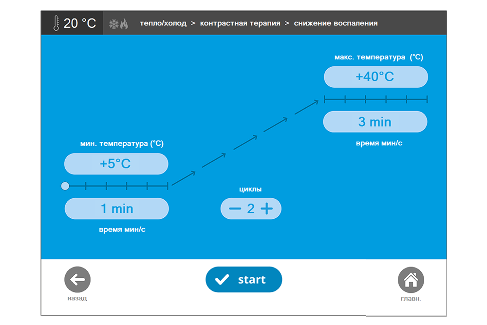 - Криотермальная терапия (контрастная терапия): Перепад температур аппликатора в циклах: 35 °С.