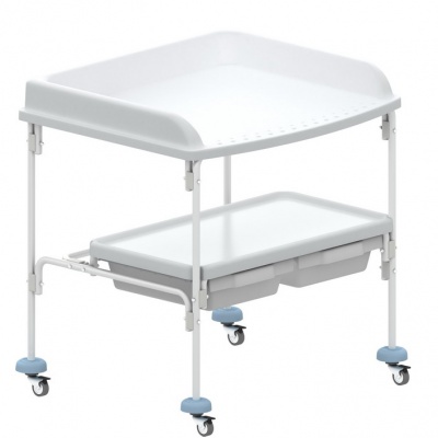 Основой конструкции служит прочный каркас из металлических труб круглого сечения, покрытый химически стойким порошковым составом. Его несварная конструкция значительно облегчает санитарную обработку, что является критически важным аспектом в условиях медицинских учреждений. На рамной конструкции удобно расположены столешница и нижняя полка с выдвижными ящиками. Нижняя полка с ящиками предназначена для упорядоченного размещения всех необходимых предметов, которые могут потребоваться во время осмотра, манипуляций или пеленания детей.
