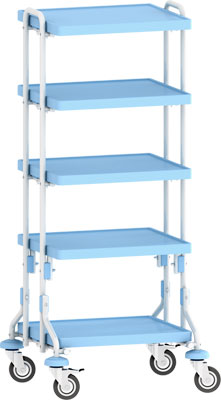 Конструкция тележки представляет собой прочный каркас из стальной трубы круглого сечения с износостойким порошковым покрытием. На раме надежно закреплены пять поддонов, изготовленных из ударопрочного полимерного материала. Эти поддоны отличаются легкостью в санитарной обработке благодаря самофиксирующейся и легкосъемной конструкции. Рабочая поверхность каждого поддона составляет 505х435 мм, а глубина — 5 мм, что оптимально для безопасного размещения инструментов.