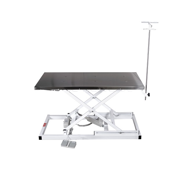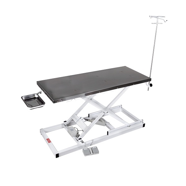 Столешница стола выполнена из высококачественной нержавеющей стали, что гарантирует ее долговечность, простоту в уходе и гигиеничность. Под столешницей удобно расположен вращающийся лоток, предназначенный для сбора отходов, что значительно упрощает поддержание чистоты во время процедур. По периметру столешницы предусмотрены специальные крючки, обеспечивающие надежную фиксацию животного, что критически важно для безопасности и точности манипуляций. Кроме того, к столешнице легко крепится штатив для инфузионных систем, что делает процесс вливания капельниц максимально удобным.