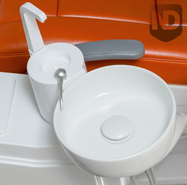 - Разборная, легкосъемная и автоклавируемая плевательница, поворачивающаяся на 90 градусов. Состоит из трех частей, с чашей из фарфора, что облегчает дезинфекцию и уход.