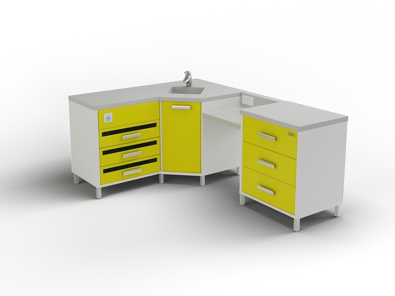 - 102-002УМ. Угловой модуль с интегрированной мойкой и смесителем, обеспечивающий удобство проведения процедур, требующих доступа к воде.