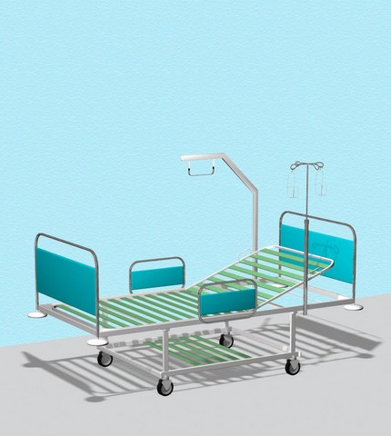 Каркас и несущая рама кровати изготовлены из металла с полимерным покрытием и установлены на четыре колесные опоры диаметром 125 мм, каждая из которых оснащена тормозом для надежной фиксации. Ложе кровати имеет одну подъемную секцию, заполненную профилированными металлическими рейками, что обеспечивает оптимальную поддержку (ДхШхВ, мм – 2010х900х545). Регулировка угла подъема секции осуществляется вручную, ступенчато, в диапазоне от 0 до 50°, позволяя точно настроить положение для пациента.
