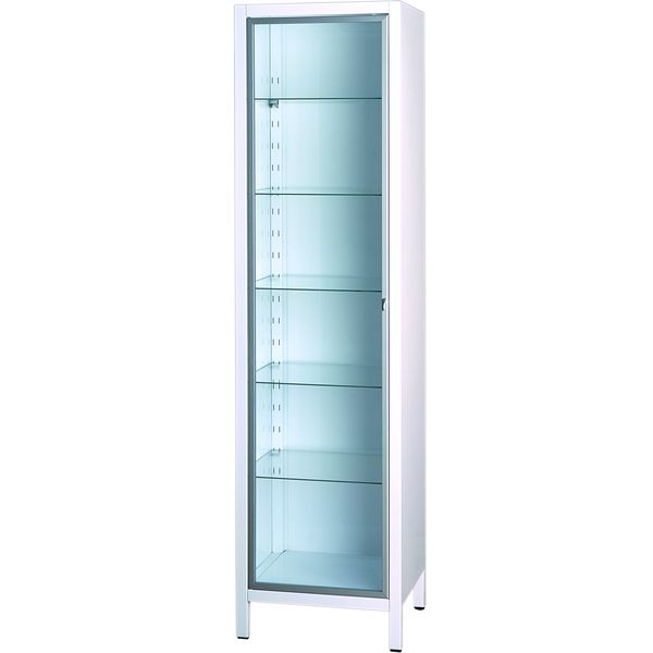 Модель оснащена одной секцией с высокими дверцами из стекла, обрамлёнными анодированным алюминиевым сплавом. Внутри расположены пять регулируемых стеклянных полок, позволяющих удобно организовать пространство для различных типов медикаментов и инструментов.