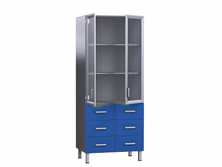 Медицинский шкаф комбинированного типа — идеальное решение для вашего кабинета. Верхняя часть оснащена застекленными дверцами, обеспечивающими обзор и удобный доступ к содержимому. Нижняя секция включает шесть выдвижных ящиков типа "метабокс", предоставляющих просторное и организованное хранение необходимых принадлежностей.