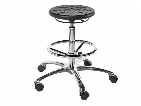 Прочное основание, изготовленное из полированного литого алюминиевого сплава, обеспечивает максимальную устойчивость и надежность. Хромированная подставка для ног повышает комфорт при длительном сидении. Пластиковые колеса диаметром 50 мм обеспечивают плавное и бесшумное перемещение табурета по любой поверхности.