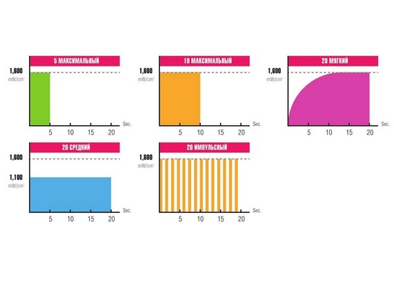 Лампа D-Lux предлагает пять режимов работы, позволяя адаптироваться к различным клиническим сценариям. Режимы «5 Max» и «10 Max» обеспечивают максимальную мощность в течение 5 и 10 секунд соответственно. Режим «20 Mid» работает на 30% мощности в течение 20 секунд. Для более деликатных процедур предусмотрен режим «20 Soft» с постепенным увеличением мощности, а режим «20 Pulse» предлагает импульсное излучение длительностью 0,15 секунд.