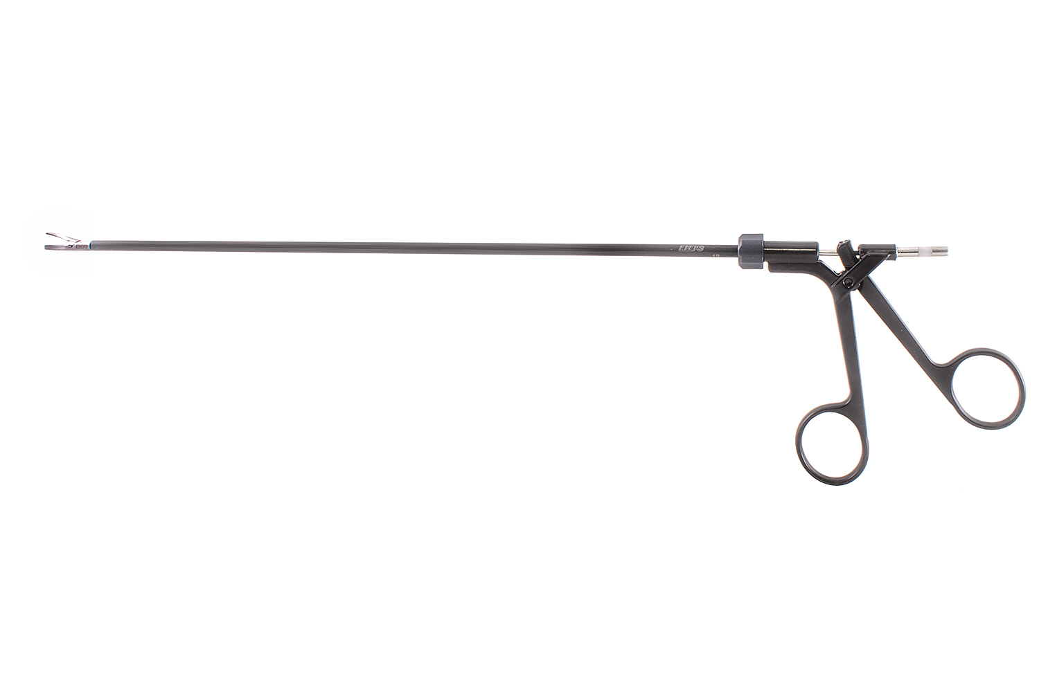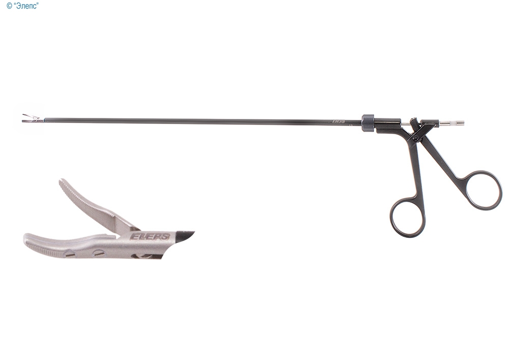 Рабочая часть инструмента надёжно фиксируется с тубусом посредством резьбового соединения. Длина рабочей части составляет не менее 314 мм, а диаметр не превышает 5 мм, что делает его удобным для широкого спектра процедур. Форма бранш изогнута и сужается к дистальному концу, что способствует точности манипуляций. Наличие поперечных наружных и внутренних насечек на браншах улучшает захват и минимизирует скольжение.