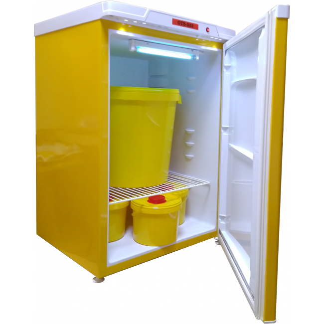 Холодильник GTS-522 соответствует всем требованиям СанПиН 2.1.7.2790-10, что подтверждает его пригодность для использования в медицинских учреждениях. Его яркий желтый цвет соответствует принятым стандартам маркировки отходов класса «Б». В комплектацию входят один бак объемом 35 литров и три бака по 2 литра, специально предназначенные для медицинских отходов класса «Б».