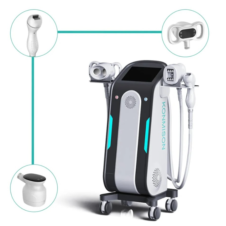 Многофункциональный аппарат Konmison JF797 предлагает комплексное решение для коррекции фигуры, объединяя вакуумную кавитацию, вакуумно-роликовый массаж и RF-лифтинг с ИК-светом. Это обеспечивает безболезненные процедуры с видимым результатом, воздействуя на жировые отложения и улучшая тургор кожи.