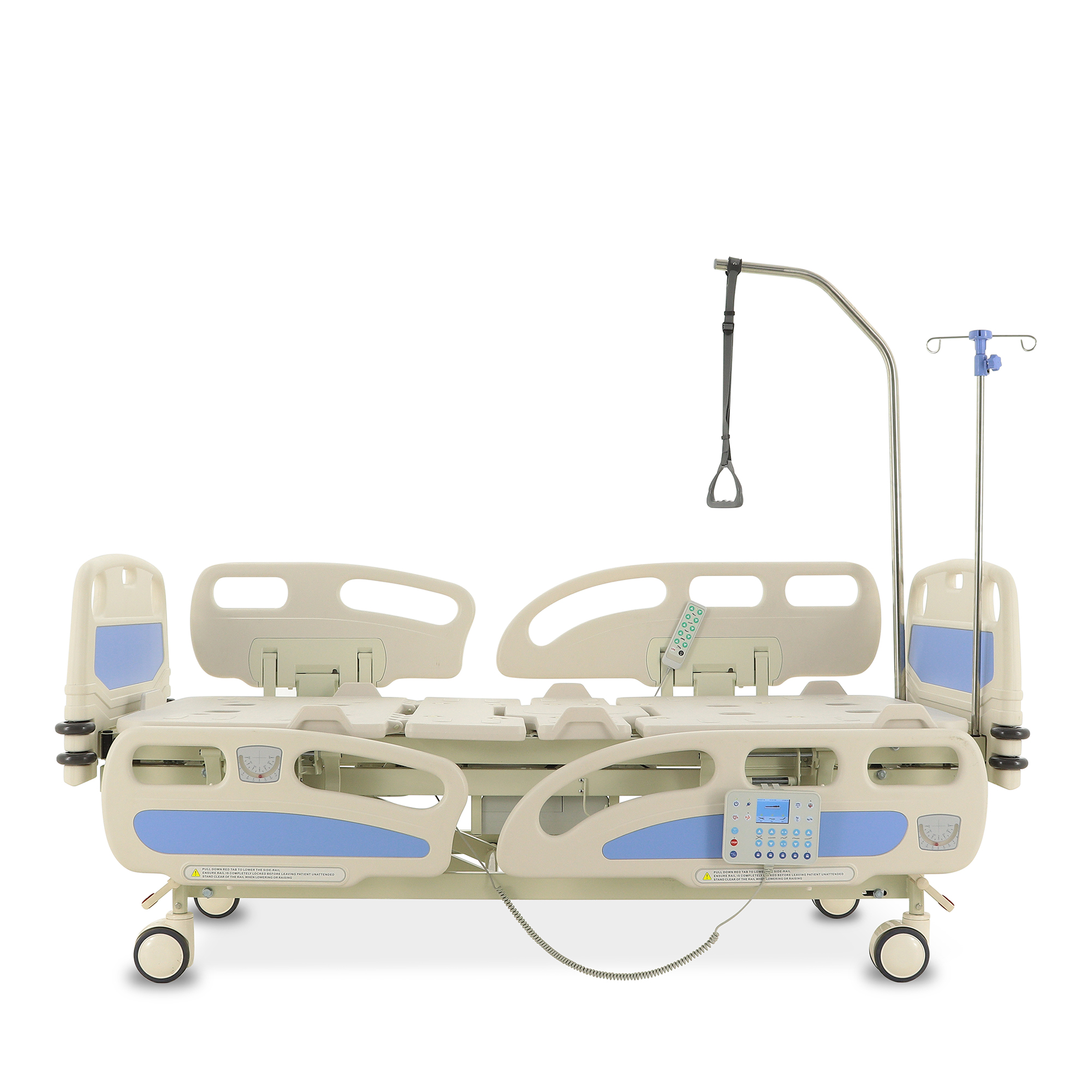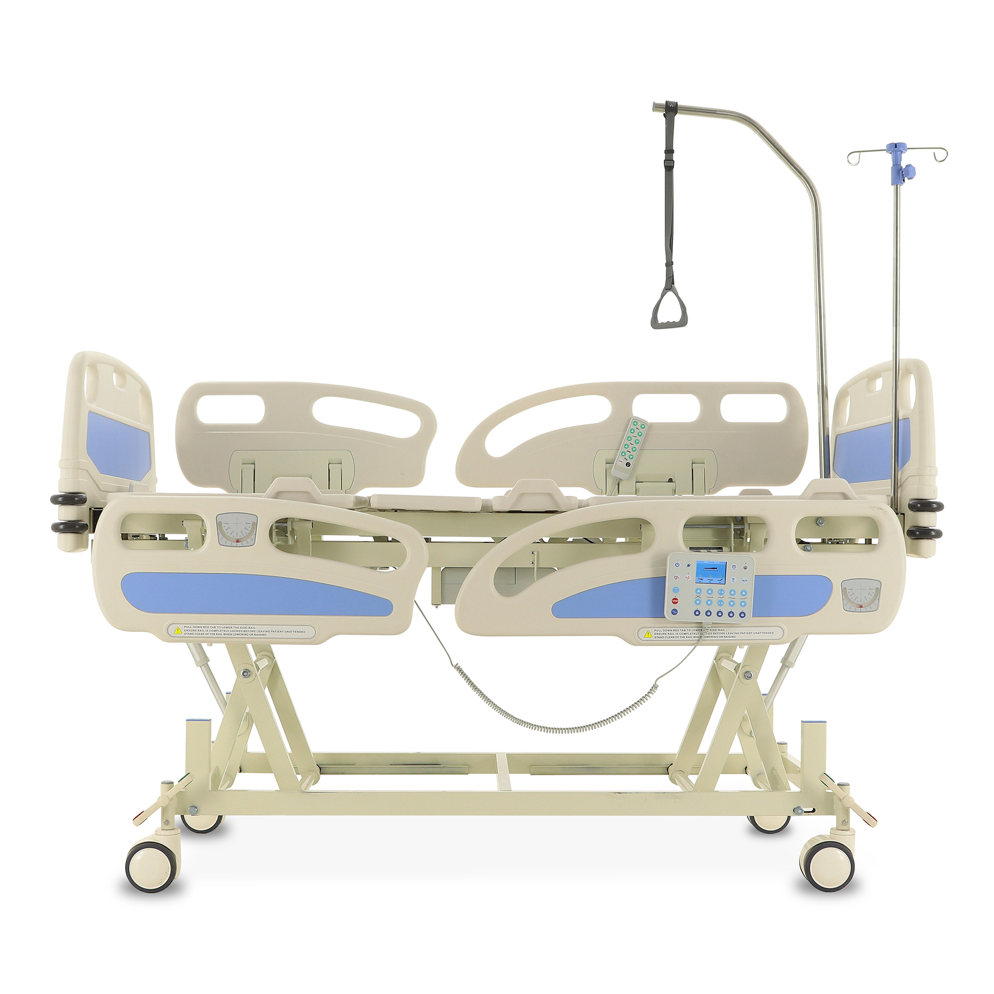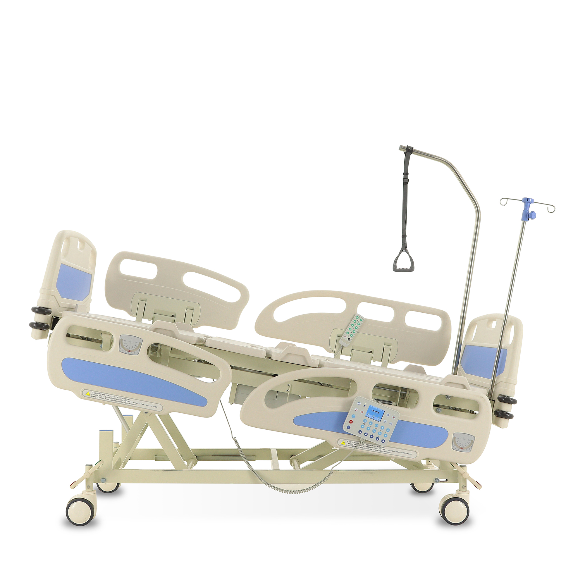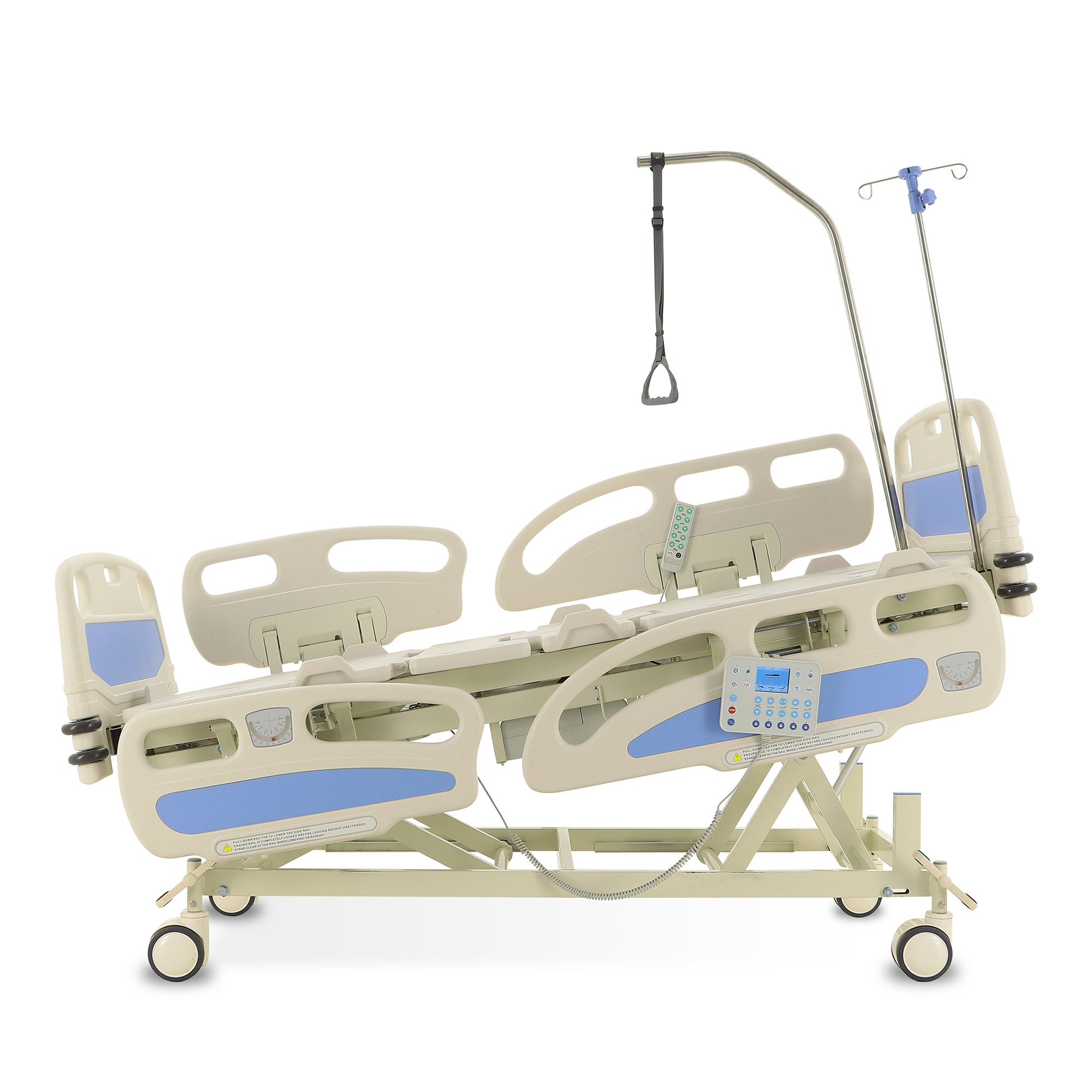 Для экстренного доступа к пациенту предусмотрены легкосъемные торцевые спинки. Боковые ограждения оснащены плавным и бесшумным механизмом складывания. Функционал кровати включает режимы CPR, Тренделенбург/Антитренделенбург, автоконтур, авторегрессия, а также звуковую сигнализацию, оповещающую о покидании кровати пациентом. Особенностью является функция «авторегрессия», позволяющая удлинить тазовую секцию на 6 см, что способствует снижению давления на уязвимые участки тела и профилактике пролежней. Комплектация включает телескопическую инфузионную стойку, дугу для подтягивания и встроенные весы.