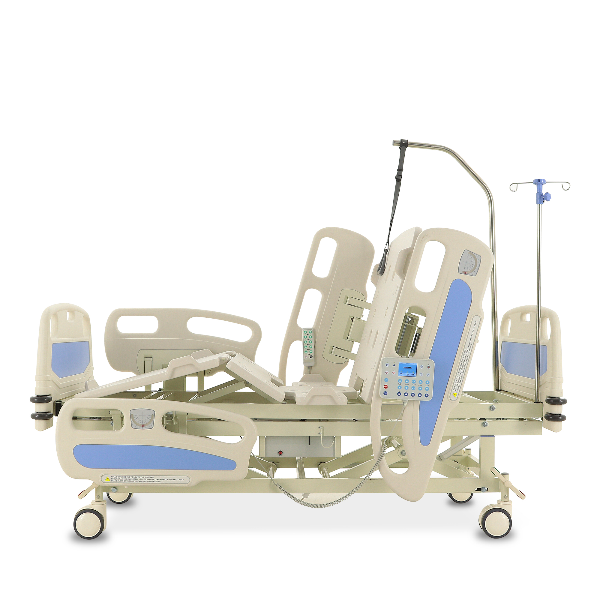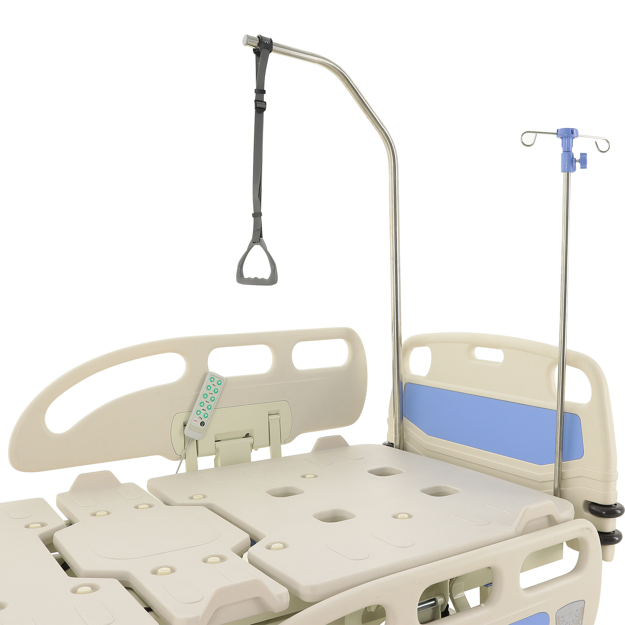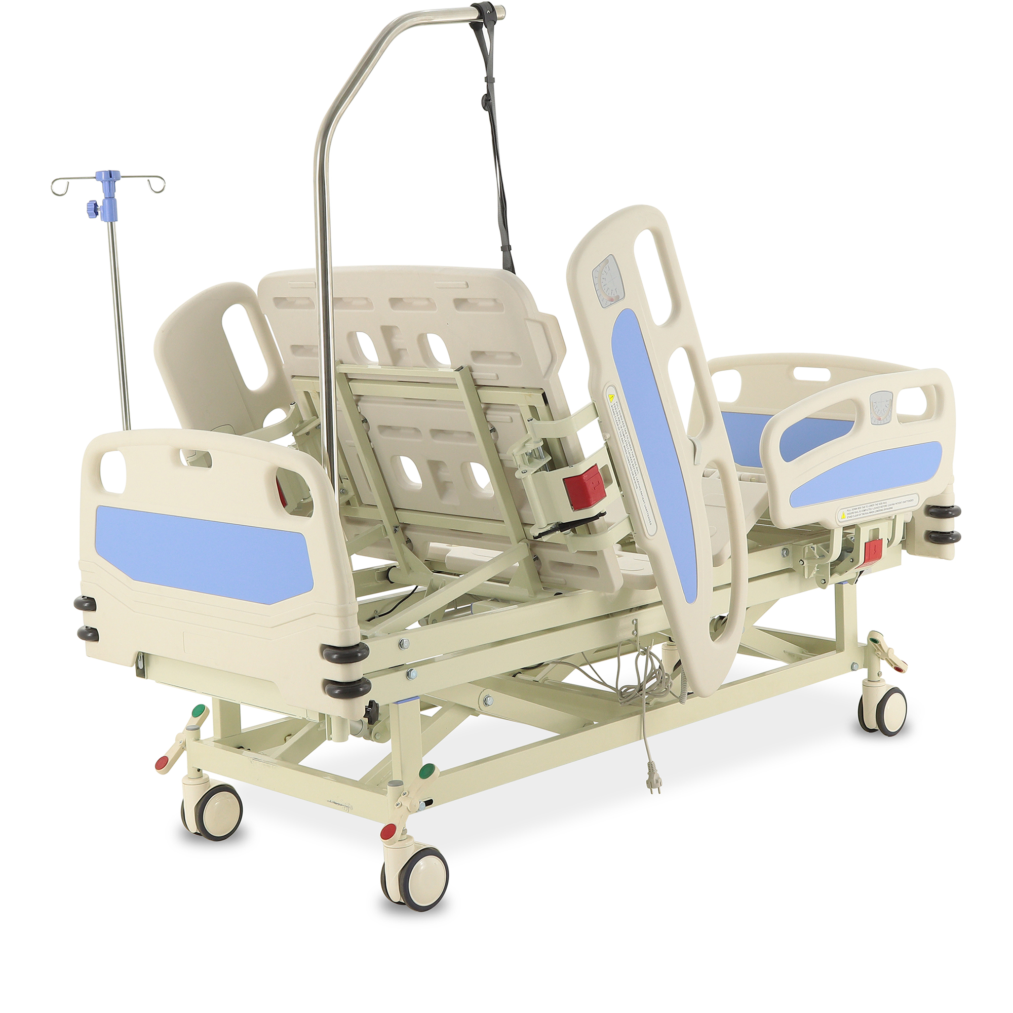 Для экстренного доступа к пациенту предусмотрены легкосъемные торцевые спинки. Боковые ограждения оснащены плавным и бесшумным механизмом складывания. Функционал кровати включает режимы CPR, Тренделенбург/Антитренделенбург, автоконтур, авторегрессия, а также звуковую сигнализацию, оповещающую о покидании кровати пациентом. Особенностью является функция «авторегрессия», позволяющая удлинить тазовую секцию на 6 см, что способствует снижению давления на уязвимые участки тела и профилактике пролежней. Комплектация включает телескопическую инфузионную стойку, дугу для подтягивания и встроенные весы.