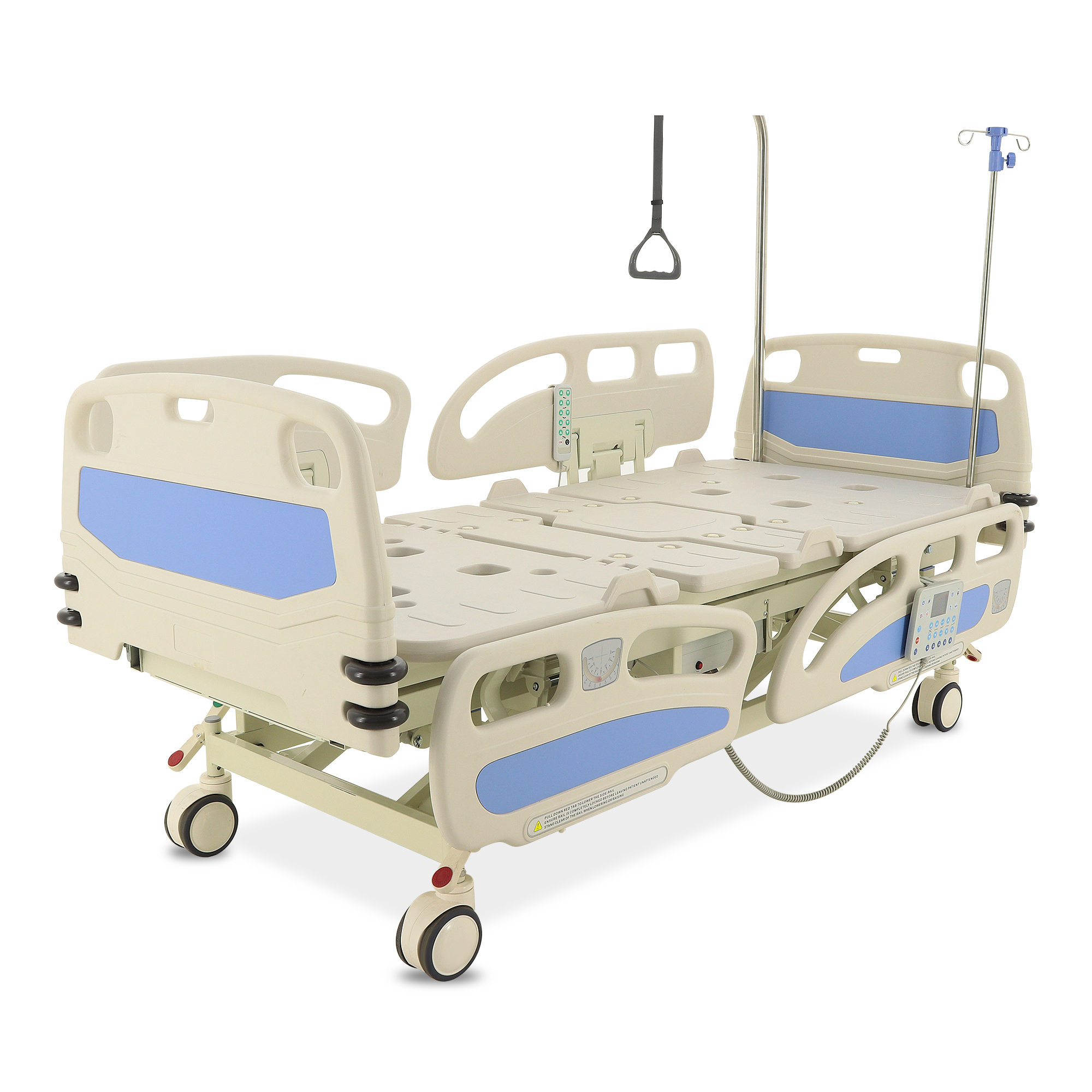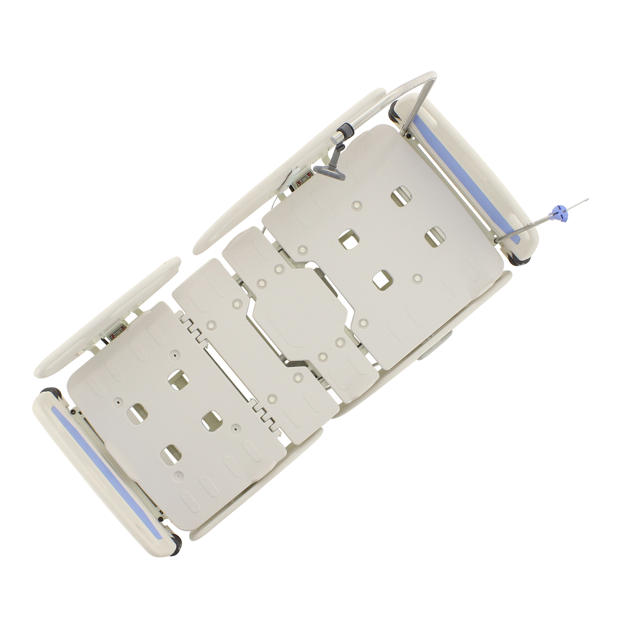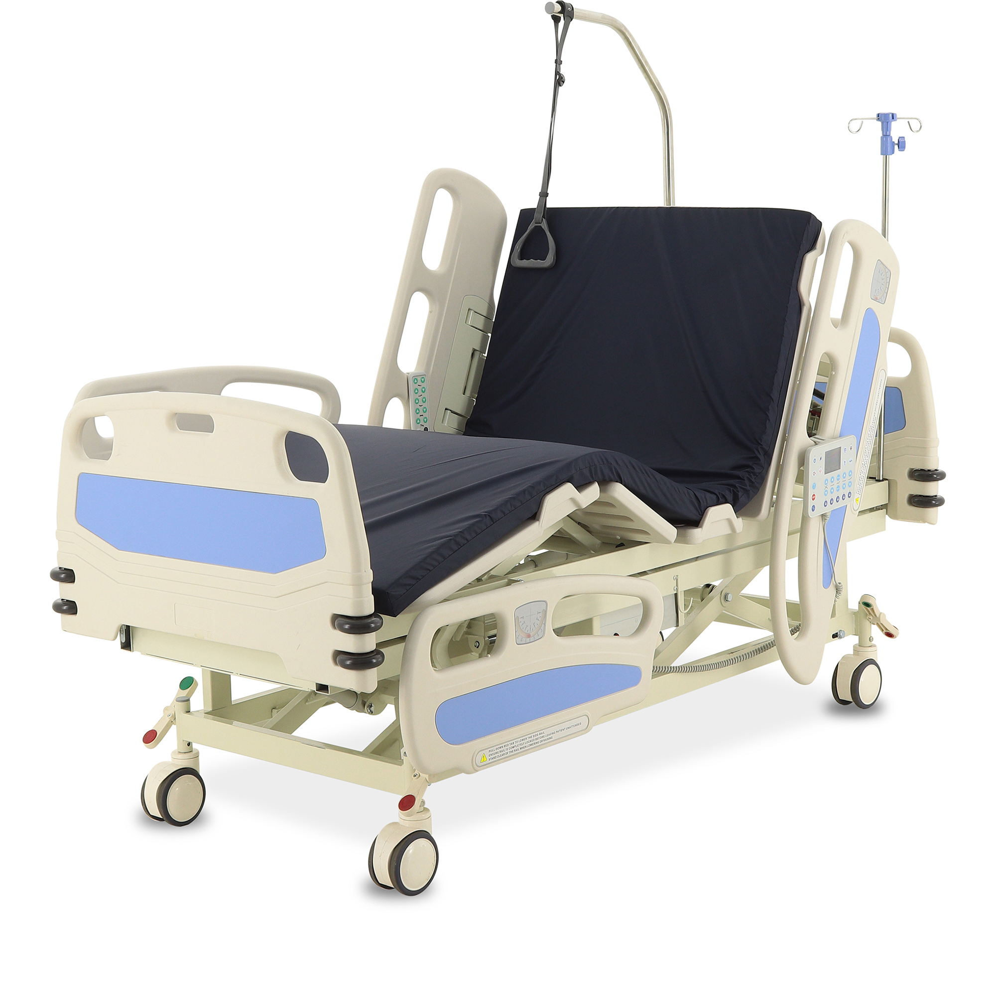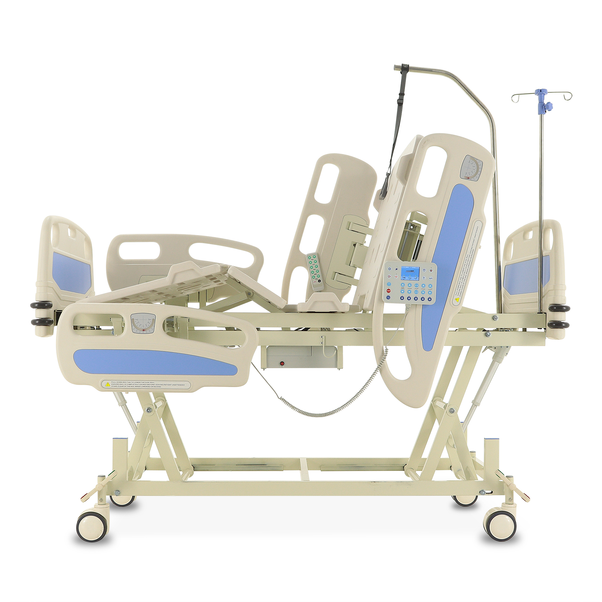 Для экстренного доступа к пациенту предусмотрены легкосъемные торцевые спинки. Боковые ограждения оснащены плавным и бесшумным механизмом складывания. Функционал кровати включает режимы CPR, Тренделенбург/Антитренделенбург, автоконтур, авторегрессия, а также звуковую сигнализацию, оповещающую о покидании кровати пациентом. Особенностью является функция «авторегрессия», позволяющая удлинить тазовую секцию на 6 см, что способствует снижению давления на уязвимые участки тела и профилактике пролежней. Комплектация включает телескопическую инфузионную стойку, дугу для подтягивания и встроенные весы.