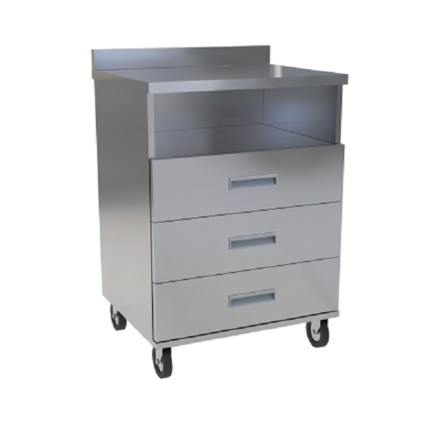 Эта цельносварная тумба оснащена надежным бортом и тремя легко выдвигающимися ящиками, гарантируя превосходную функциональность. Перемещение тумбы по операционному блоку осуществляется легко благодаря четырем колесным опорам, две из которых снабжены тормозным устройством для фиксации в нужном положении.