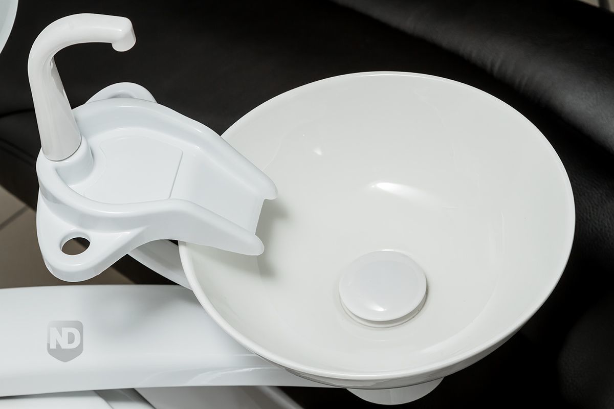 - Интегрированный гидроблок: Оснащен поворотной неразборной керамической плевательницей, которая легко очищается и поворачивается на 90 градусов. Встроенные две бутыли обеспечивают подачу дистиллированной воды и дезинфицирующего раствора, а автоматическое обмывание плевательницы и наполнение стакана оптимизируют рабочий процесс.