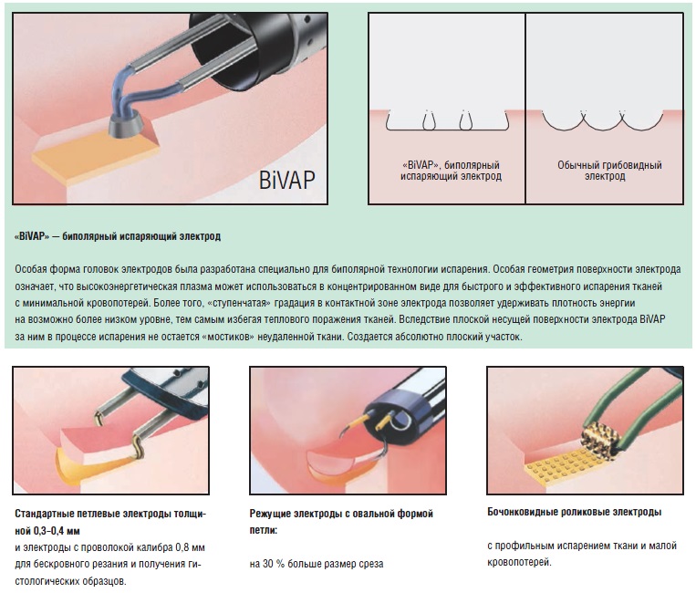 Кроме того, принцип «пошагового» контакта электрода с рабочей зоной позволяет регулировать интенсивность энергии до оптимального уровня, предотвращая тем самым термическое повреждение прилежащих тканей. Благодаря плоской структуре опорной головки, вапоризация с использованием электрода BiVAP исключает формирование «мостов» из необработанной ткани, обеспечивая равномерное и полное воздействие.